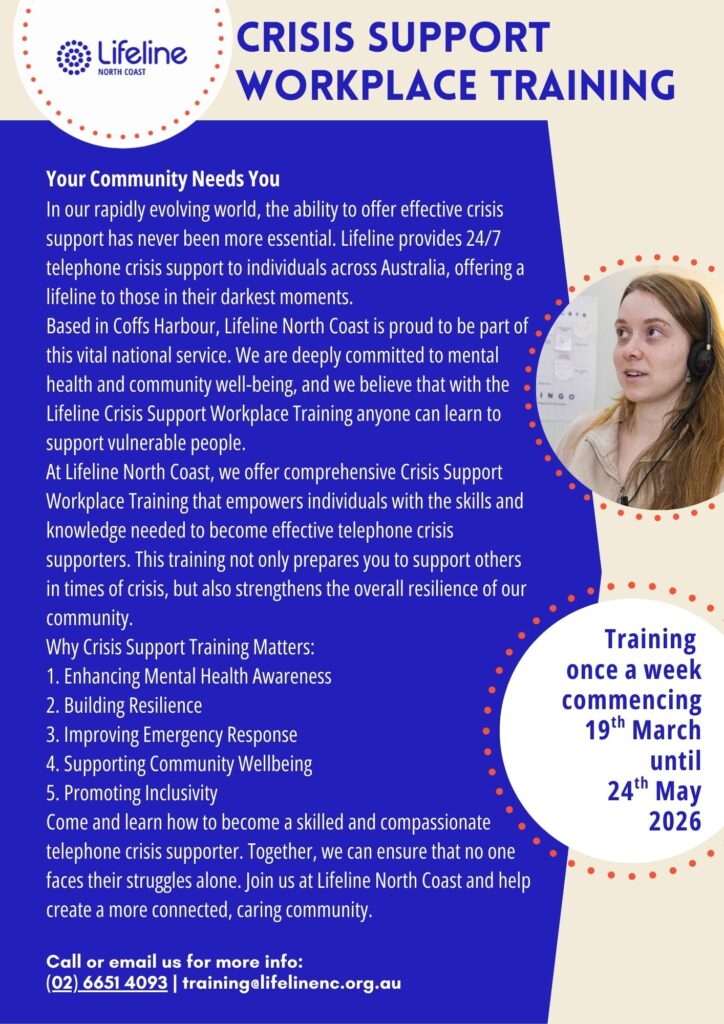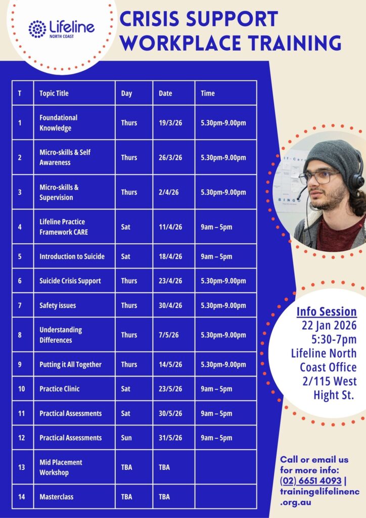 Lifeline North Coast delivers the training for CHCSS00113 Crisis Support Skill Set qualification on behalf of Lifeline Australia RTO 88036.