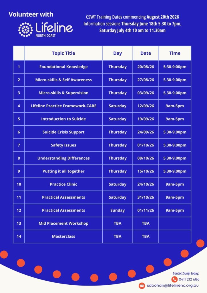 The training takes place over 12 months. Successful completion results in Accreditation as a Lifeline Crisis Supporter and obtaining a nationally recognised Statement of Attainment in: